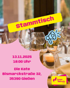 Du hast Lust über das aktuelle politische Geschehen zu diskutieren? Dann komme doch gerne zu unserem November Stammtisch in Die Kate (Bismarckstraße 32, 35390 Gießen) vorbei und diskutiere mit uns in gemütlicher Atmosphäre bei leckerem Essen und dem ein oder anderen Bierchen 🍔🍺